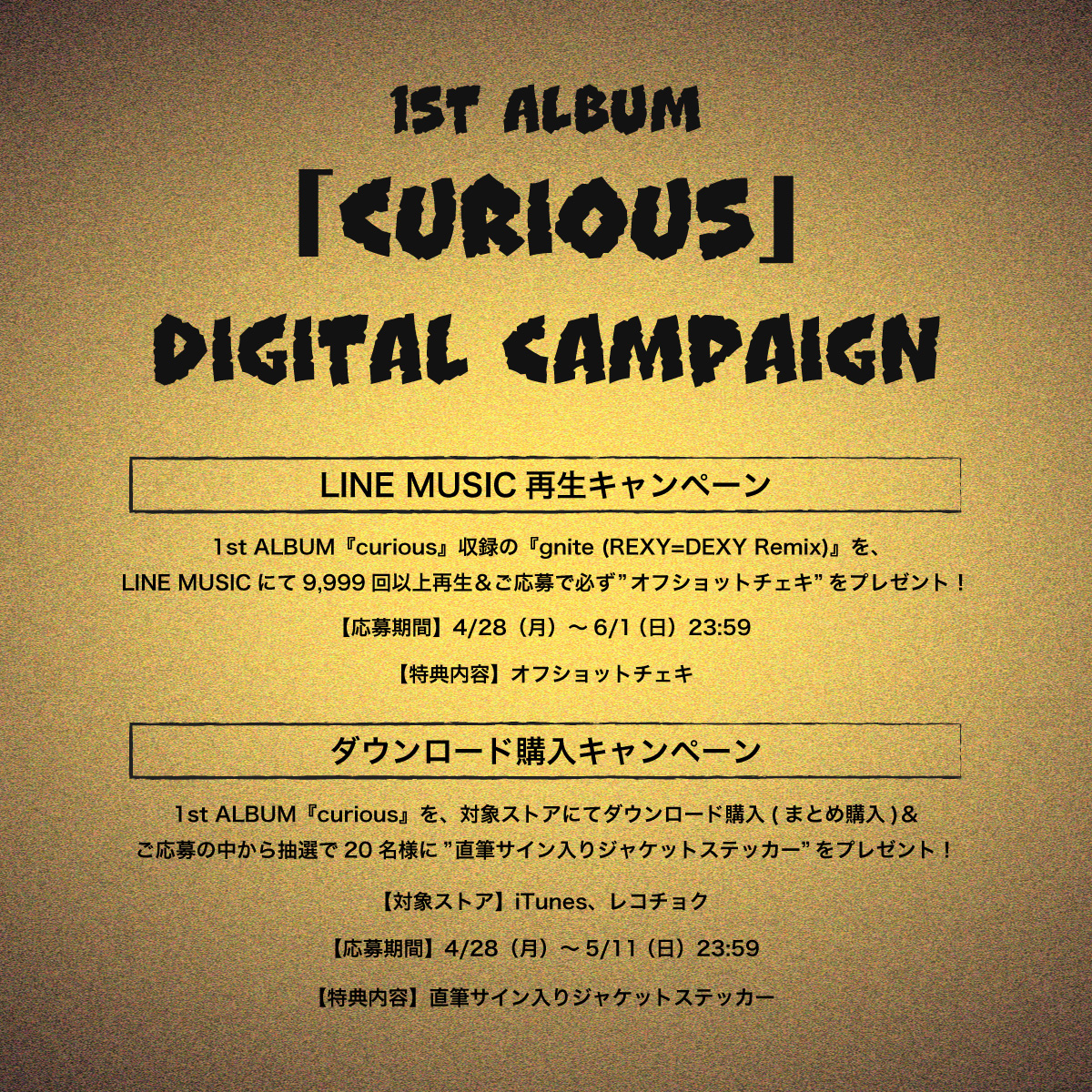 1st ALBUM『curious』を、対象ストアにてダウンロード購入(まとめ購入)され、ご応募いただいた方の中から抽選で20名様へ、”直筆サイン入りジャケットステッカー”をプレゼントいたします!
