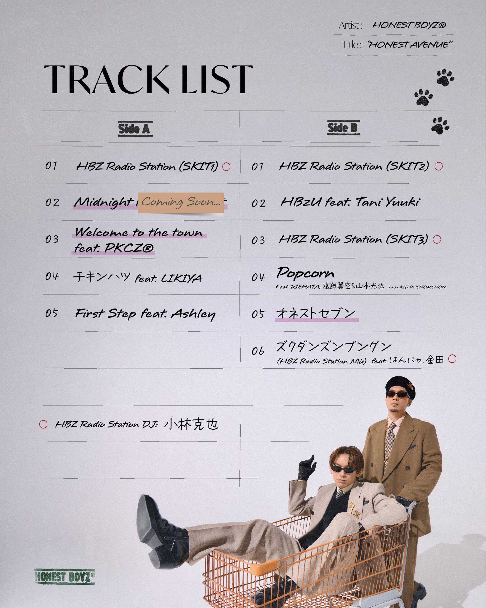 今回公開されたアーティスト写真およびジャケット写真のコンセプトは、HONEST BOYZ®︎らしい「大人の遊び心」。ジャケットスタイルの大人びた装いに加え、「AVENUE」の世界観を表現したショッピングカートや犬といったモチーフを取り入れることで、肩の力を抜いた遊び心あふれるビジュアルを表現しています。無邪気さとクールさが共存する、HONEST BOYZ®︎ならではの世界観が感じられる写真となりました!